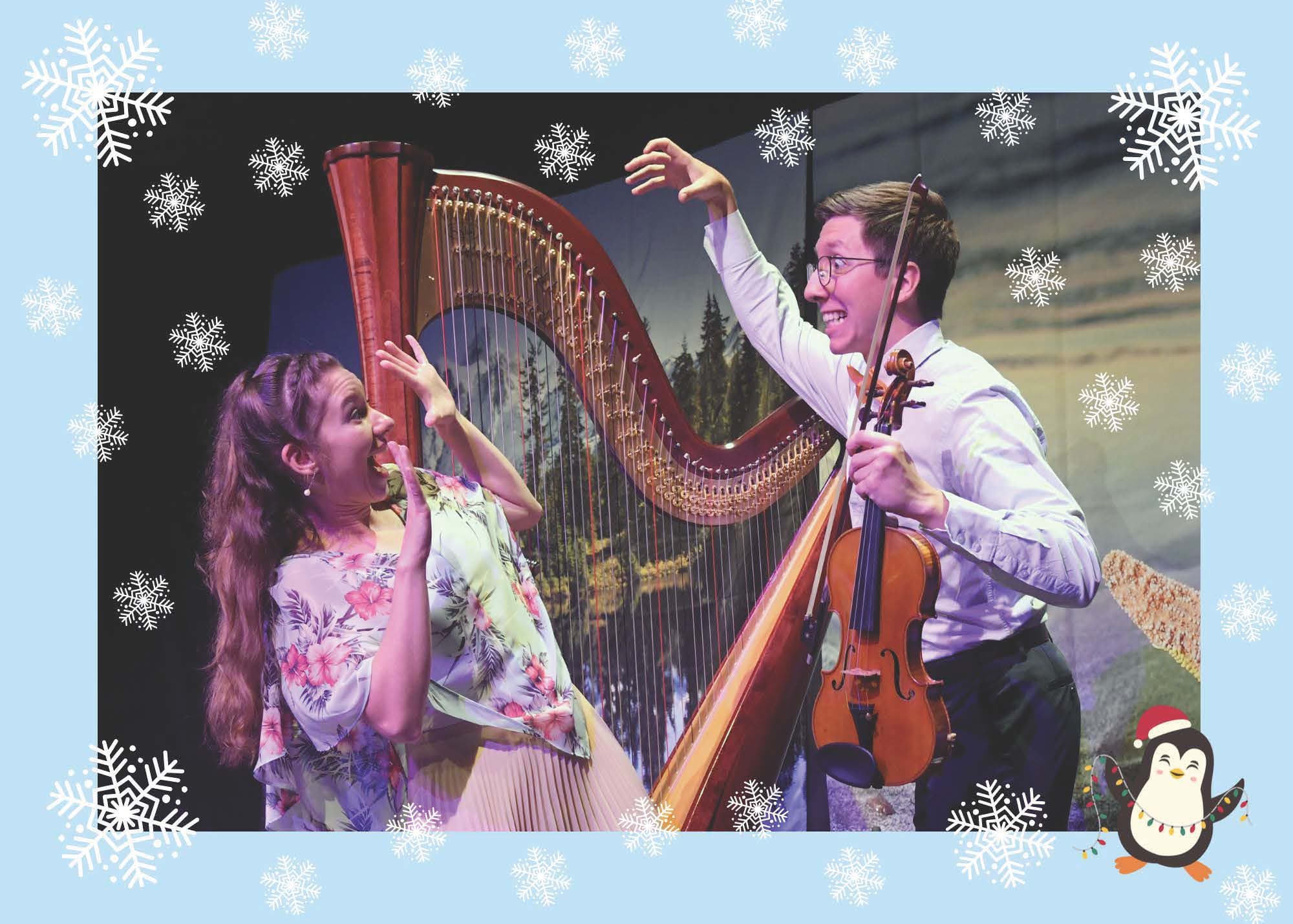 Cette année, la harpiste Amaëlle Savary et le violoniste Baptiste Jean ne savent pas où partir en vacances pour Noël. Qu'il est difficile de choisir entre la mer ou la montagne pour passer les fêtes. Chacun leur tour, ils essaieront de se convaincre avec des arguments des plus loufoques. Un duel musical de haut vol vous attend mêlant harpe, violon, chant, danse et facéties en tout genre. Ils vous proposent de partager avec eux un moment rafraîchissant. Votre présence fera peut-être toute la différence ? Ce concert spectacle s'adresse à un public de tous âges.