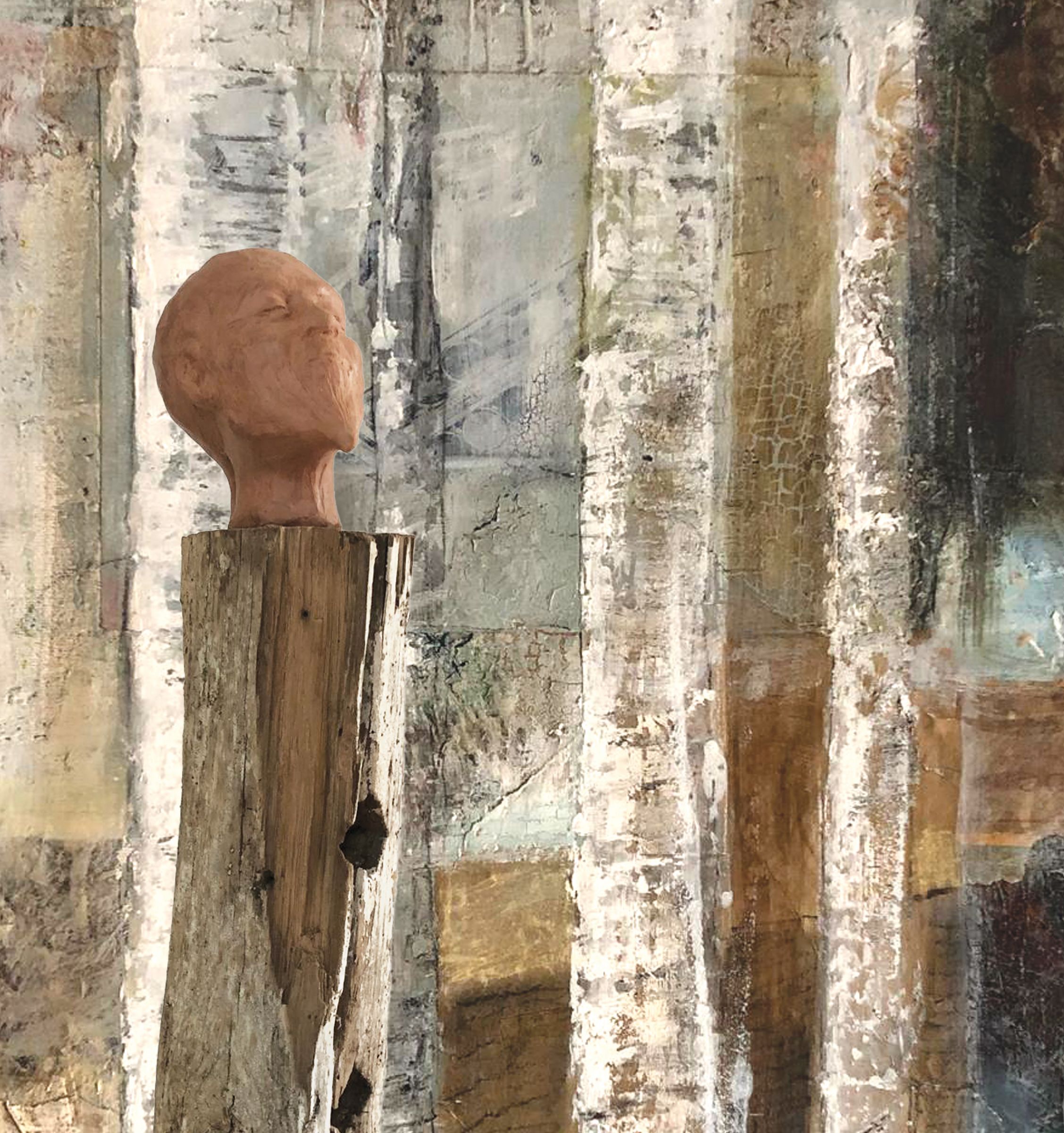 Marie-Anne Grelier exprime dans son travail son réel attachement pour les arbres et forêts. Ses tableaux révèlent le regard qu'elle porte sur ce monde vivant et fragile. Elle crée, sur de hauts socles de bois, des sages qui semblent nous inciter à prendre le temps d'une pose, comme pour nous alerter sur l'urgence d'agir.